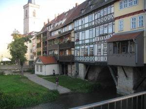 Op de fiets (onverantwoord in ‘Oost-Duitsland’, zoals de womo-stellplatz beheerder beweerde, automobilisten zijn hier niet dol op fietsers…) naar de stad om een bliksembezoek te brengen. Met name de Krämerbrücke is erg mooi (een rand van vakwerkhuizen over het water gebouwd, dus een soort van ‘hangende straat’…) Op de stellplatz vertelden onze buurtjes (op school geweest in Oost-Duitsland, voor de bouw van de muur naar het Westen gevlucht…) dat zij vlak na de Wende in Erfurt waren geweest. Het was een grauwe, grijze stad, maar daar is nu niets meer van terug te vinden.